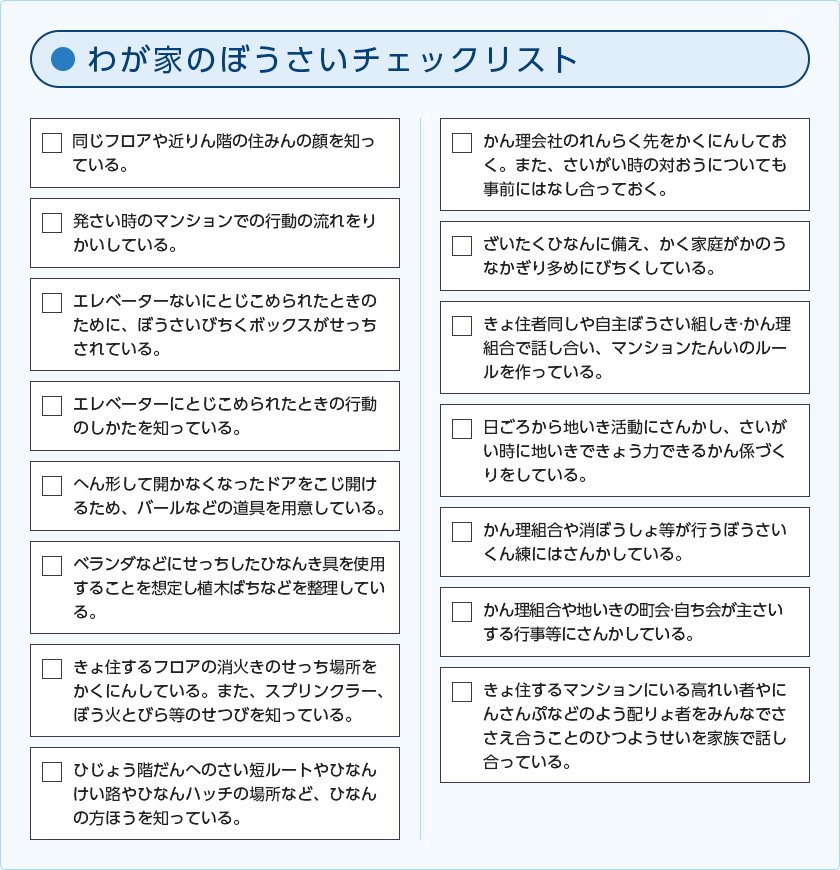 いっぱんてきにきょうどうじゅうたくはたいしんせいが高く、地しんに強いといわれていますが、そのたて物の高さゆえのじゃくてんもあります。すんでいる人はきょうどうじゅうたくのぼうさい上のとくちょうをよく知り、そなえることが大切です。