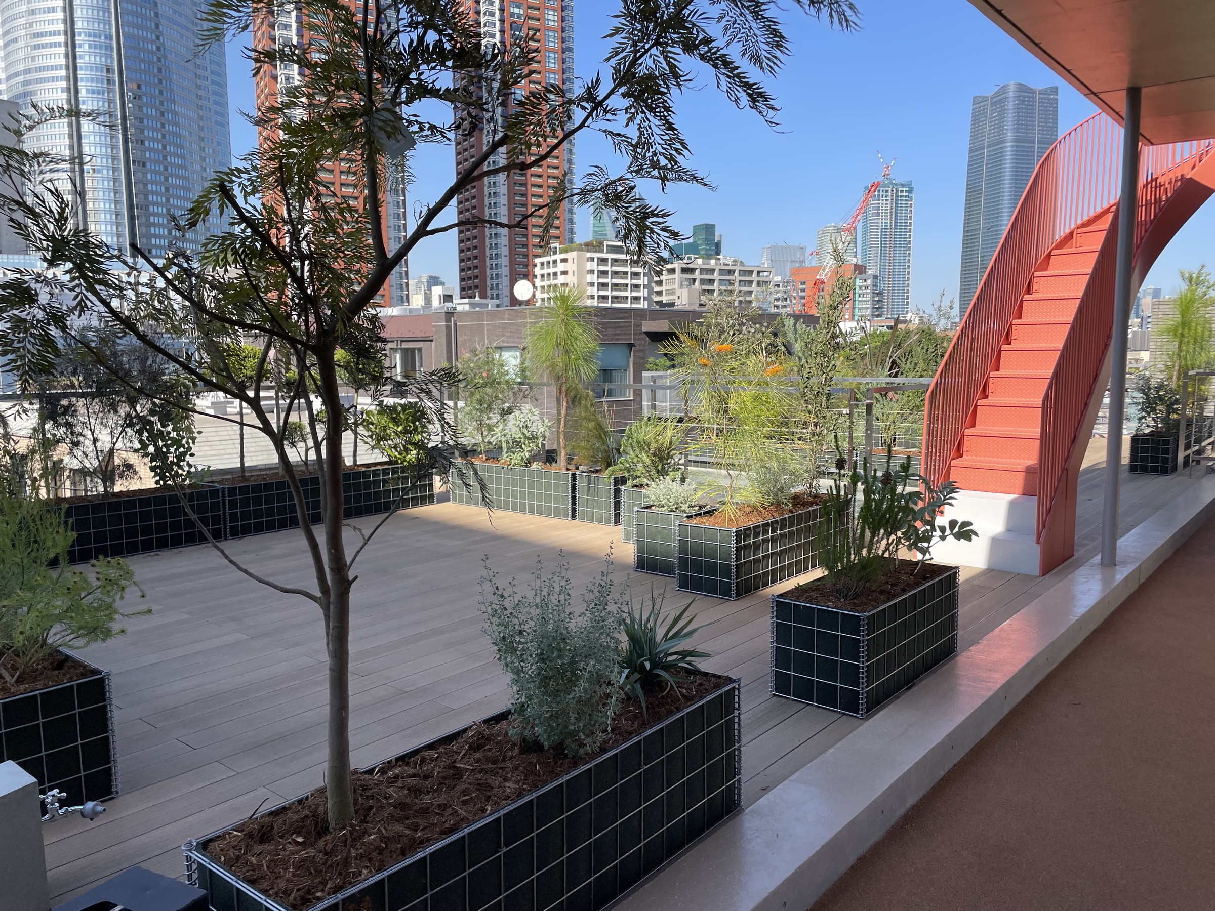 屋上防水の更新などメンテナンス時の負担軽減のため、塗膜防水の屋上面に鋼製下地のデッキを敷き、デッキの上にじゃかごプランター(金網を用いてプランター状に加工したもの)を設置しています。