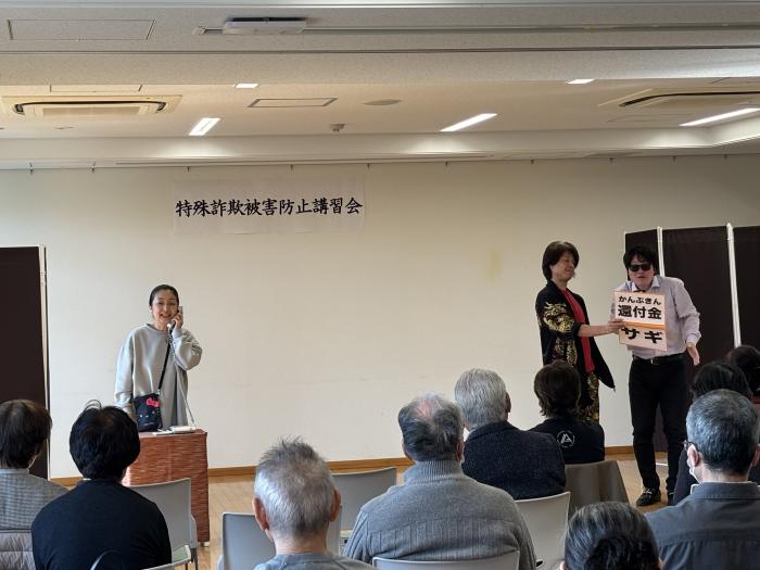 演劇 プロの役者さんに、特殊詐欺の手口(オレオレ詐欺、還付金詐欺、預貯金詐欺、フィッシング詐欺、サポート詐欺など)や対策を楽しく分かりやすく講演していただきました。 |