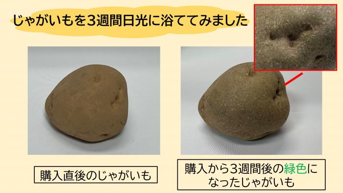 ⑥じゃがいもがみどり色に変化するのは、光によってもなるということをこの動画で知りました。慌てて、台所に置いてあったじゃがいもを確認したところ、みどり色にはなっていませんでしたが、芽がでていました。早速調理して食べきりました( 汗 )