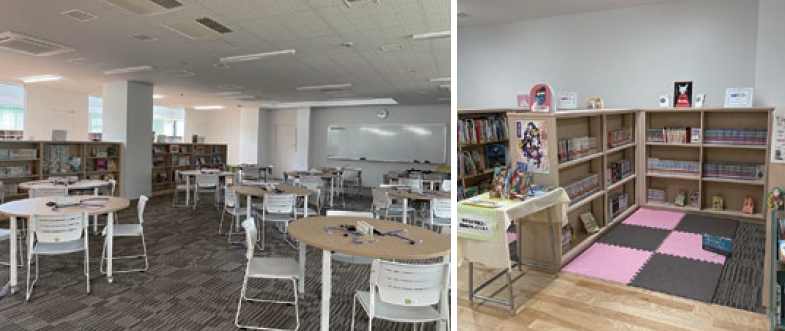 図書館は司書が勤務する本格的な施設。漫画コーナーのほか、定期テスト前は満席となる自習コーナーや円形机のPC実習コーナーも設置しています