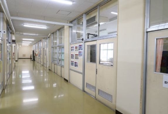 廊下はゆとりのある空間で、一般的な小学校よりも広く幅をとっています。生徒が伸び伸びと過ごせる校舎です