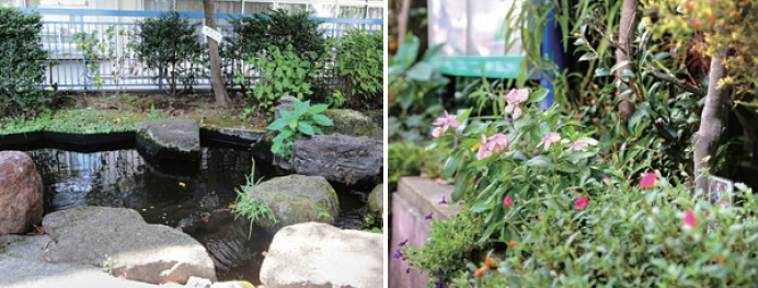 校庭にはビオトープ、裏庭には池や竹林、日本庭園があり、とても青山の中心にあるとは思えない校舎です。学校を取り囲む花壇には、地域住民、卒業生、保護者たちのボランティアによって常時20種類以上の花が植えられています。ここにも地域の人たちの深い青南愛が…