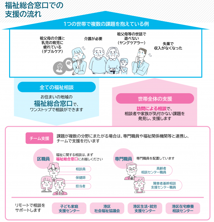 - 子ども家庭支援センターや港区社会福祉協議会、港区生活・就労支援センター、港区在宅療養相談センター等は、リモートで相談をサポートします。
