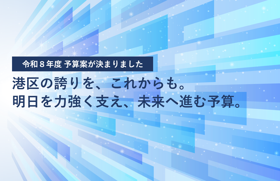 令和8年度予算は、これまでの取組をさらに前へ進めるため、「港区の誇りを、これからも。明日を力強く支え、未来へ進む予算」として編成しました。