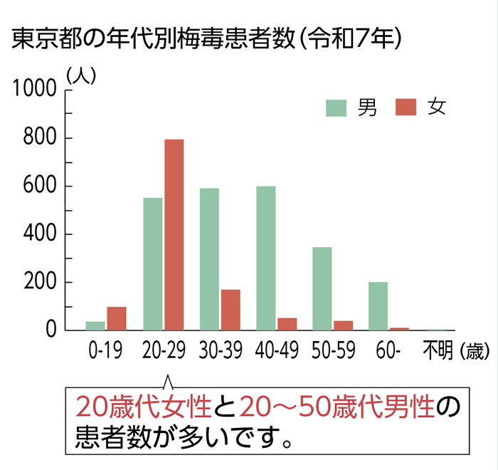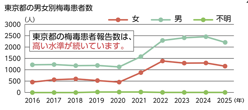 令和7年の東京都の患者報告数は3,386人で、昨年よりも減少しましたが、高い水準は続いています。感染に気付きにくいため、治療の遅れや感染拡大につながりやすく、感染予防と早期発見が大切です。