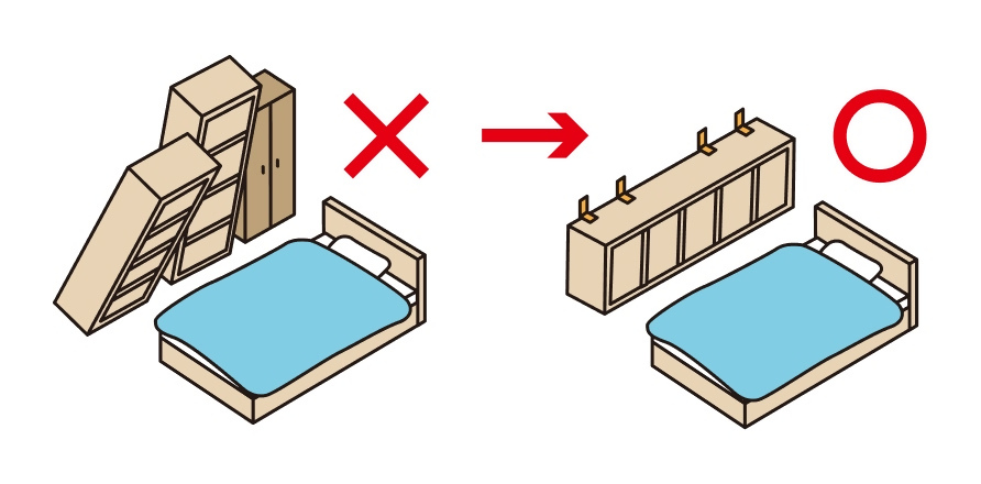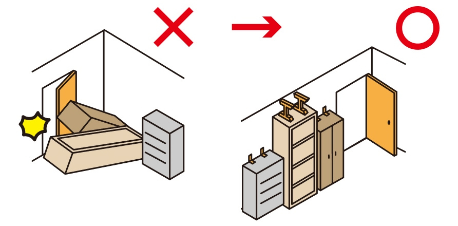 家具の置き場所を工夫するだけでも室内の安全対策につながります。寝ているところに倒れてくる家具はないか、倒れたときにドアや避難経路をふさぐような配置になっている家具はないか確認しましょう。