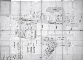 A kokenzu is a pictorial register that records information on each town lot, including frontage, depth, area (in tsubo), price ( koken-kin), komadaka (price per unit frontage), landlord’s name, and caretaker’s name. This particular document was created in March 1744 and depicts all of Minami-Higakubo-cho and parts of the adjoining Miyamura-cho and Nagasaka-cho, which correspond to the present-day area around the Toriizakashita intersection. Compared with the towns within the Edo Castle area, extant kokenzu of the peripheral towns that developed from farmland into urban districts with the expansion of the city are rare. This map is a valuable resource for conveying information about outlying towns and town lots to the present day.