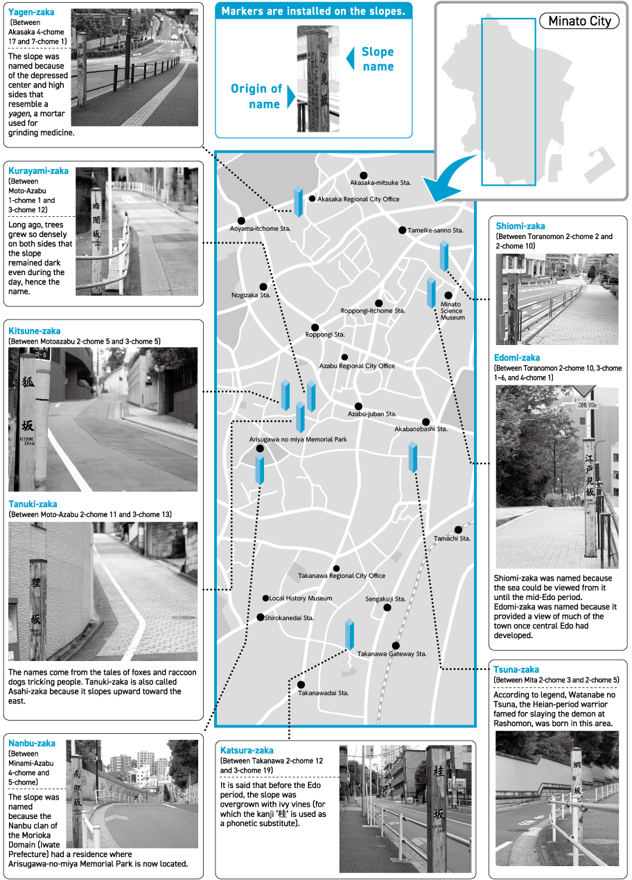The area now known as Minato City has been populated since the Edo period. Areas with samurai residences, temples, and shrines often had no town names, so slopes were named to serve as landmarks.