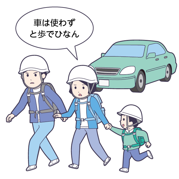 ひなんはとほがげんそくです。東日本大しんさいでは、車でひなんしたことでたすかった人もいますが、じゅうたいにまきこまれてみうごきがとれず、車ごとつ波にのみこまれていのちをおとしてしまった人もおおかったのです。