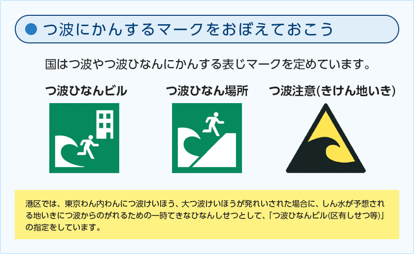 港区では、東京わんないわんにつ波けいほう、大つ波けいほうがはつれいされたばあいに、しんすいがよそうされるちいきにつ波からにげるためのいちじてきなひなんしせつとして、「つ波ひなんビル(区ゆうしせつなど)」のしていをしています。