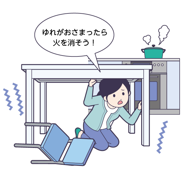 地しんのときに火をけすには、3つのチャンスがあります。地しんのゆれでガスのきょうきゅうを自動でストップするガスマイコンメーターがほとんどの家にあるので、まずは自分の身をまもりましょう。