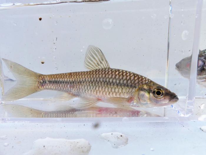 モツゴ/関東地方ではクチボソとも呼ばれています。春から夏に石や木片等に産卵します。(「港区みどりと生きもの2010」港区平成22年3月発行より)