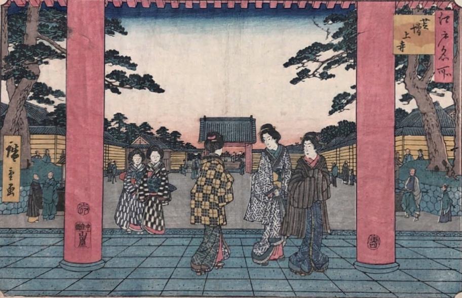 歌川廣重の浮世絵「江戸名所 芝増上寺」。三解脱門から立ち並ぶ練塀と大門。左一番手前が廣度院