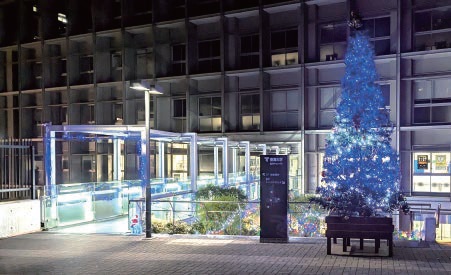 正面広場の中心に彩られるクリスマスツリーはもちろんのこと、その左側にある1号館への渡り廊下も華やかな光に包まれ、その下の階段も美しく飾られます。ここは外からは見えない穴場になっていますので、ぜひ中に入ってご覧になることをお勧めします。